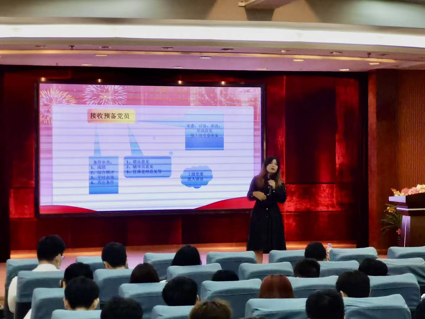 由第二黨支部組織(宣傳)委員陳媛同志講解發(fā)展黨員階段的五個流程:申請入黨階段,積極分子階段,發(fā)展對象階段,吸收為預備黨員階段,正式黨員階段。其中在申請入黨階段,她特別強調入黨的同志需自愿提出入黨申請,并上交入黨申請書,期間可以先了解入黨的流程和要求。同時鼓勵申請入黨的青年團員積極參加黨校培訓,通過黨校培訓端正入黨動機,提高理論基礎。