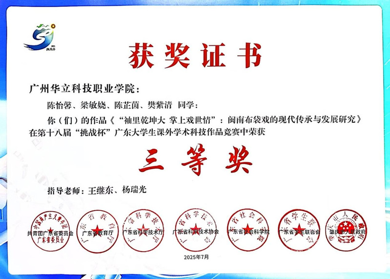 我院王繼東老師指導(dǎo)學(xué)生創(chuàng)作的作品《“袖里乾坤大 掌上戲曲情”:閩南布袋戲的現(xiàn)代傳承與發(fā)展研究》榮獲“第十八屆‘挑戰(zhàn)杯’廣東大學(xué)生課外學(xué)術(shù)科技作品競(jìng)賽” 三等獎(jiǎng)。
