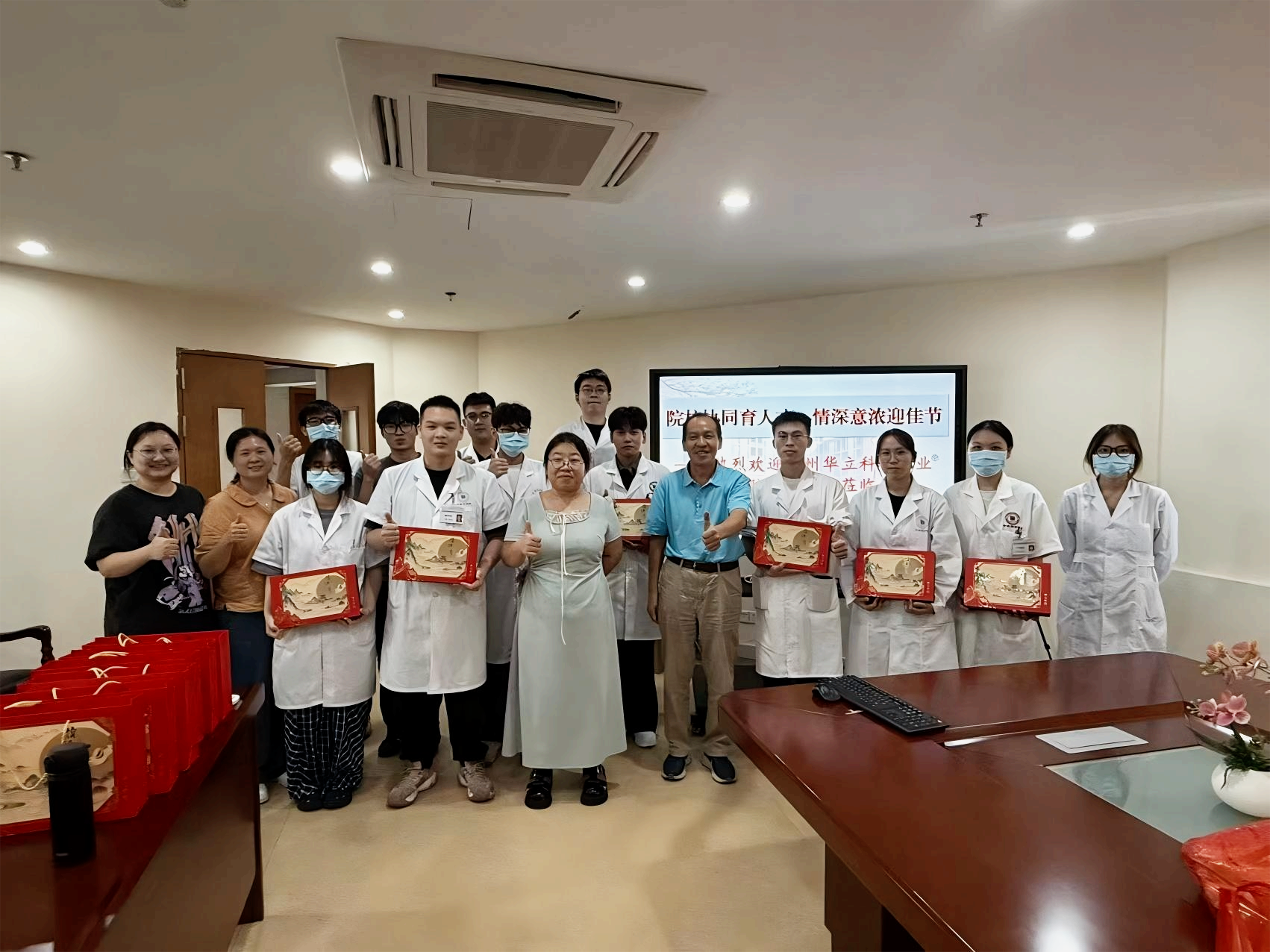 座談會在溫馨的節(jié)日祝福中結(jié)束。會后,學(xué)院領(lǐng)導(dǎo)親自將象征著團(tuán)圓與美滿的中秋月餅和水果禮盒送到每一位學(xué)子手中。緊接著,全體人員合影,記錄下這充滿關(guān)懷與期望的時刻。此次慰問,不僅驅(qū)散了學(xué)子們的思鄉(xiāng)之情,更堅(jiān)定了他們的從醫(yī)信念,也為院校合作的深化寫下了濃墨重彩的一筆。
