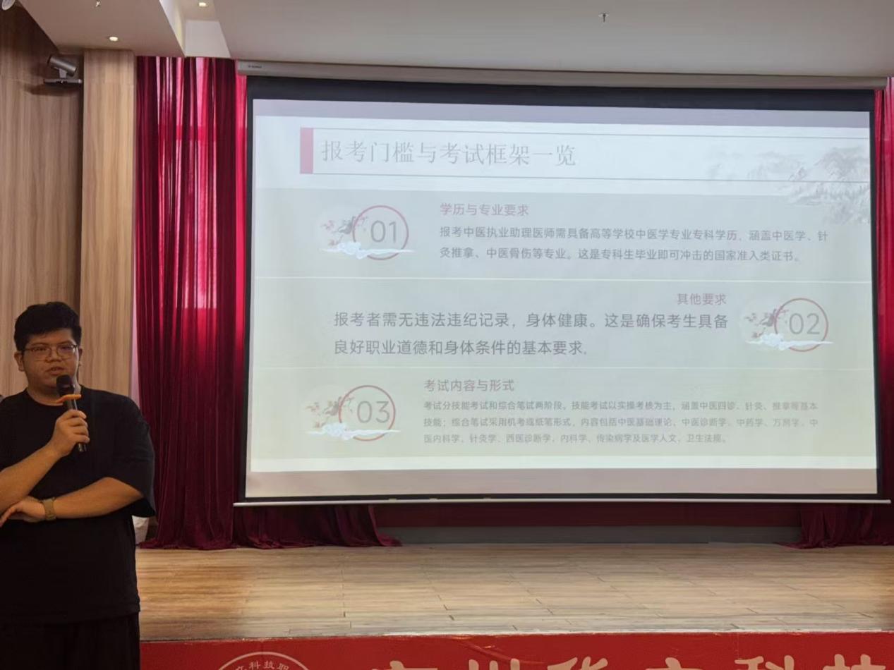 隨后,吳秉晉老師以“執(zhí)醫(yī)路,少年行”為主題開展專題分享。吳老師結(jié)合自身經(jīng)歷,從中醫(yī)藥行業(yè)就業(yè)現(xiàn)狀、職業(yè)發(fā)展方向、專業(yè)學(xué)習(xí)、升學(xué)以及考證等多個(gè)維度為同學(xué)們進(jìn)行了系統(tǒng)講解,還針對(duì)同學(xué)們普遍關(guān)心的職業(yè)選擇困惑、能力提升重點(diǎn)等問題給出了具體建議。