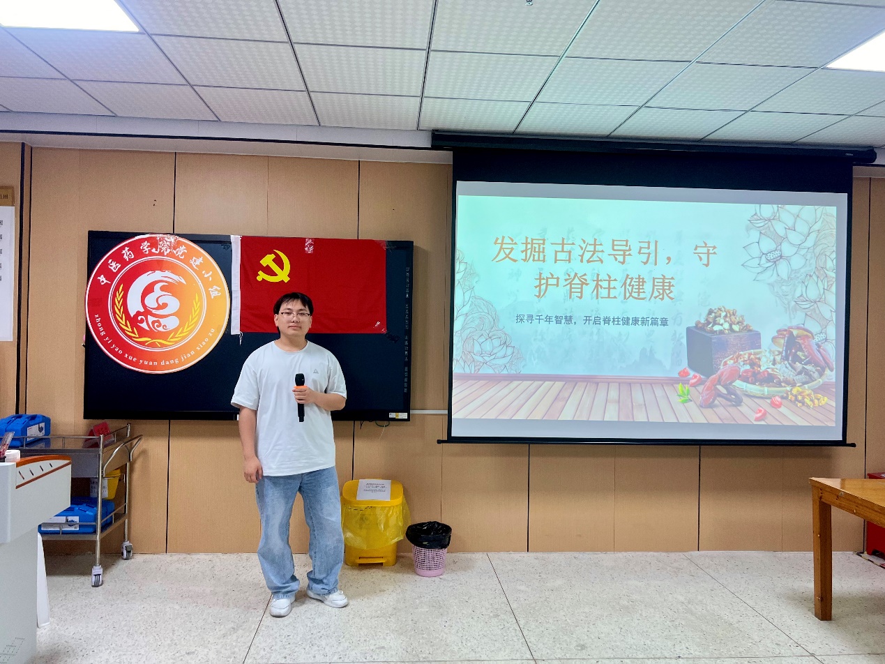 2025年11月26日晚,由中醫(yī)藥學(xué)院直屬黨支部主辦,中醫(yī)藥學(xué)院黨建小組與中醫(yī)藥應(yīng)用研究所協(xié)辦的黨建引領(lǐng)“亦生亦師”項(xiàng)目化課程系列講座第六期——“發(fā)掘古法導(dǎo)引,守護(hù)脊柱健康”在西二104針灸推拿實(shí)訓(xùn)室成功舉行。本次活動(dòng)吸引了中醫(yī)藥學(xué)院50名學(xué)生積極參與,旨在傳承中醫(yī)養(yǎng)生智慧,提升學(xué)生脊柱健康意識(shí)與自我保健能力。